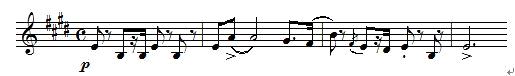 正因为旋律具有情感色彩,它能引起人们情感上的共鸣。作曲家就利用这一特征,来写作表现各种各样情绪的旋律。例如贝多芬(Beethoven)第五交响曲末乐章的开始部分: