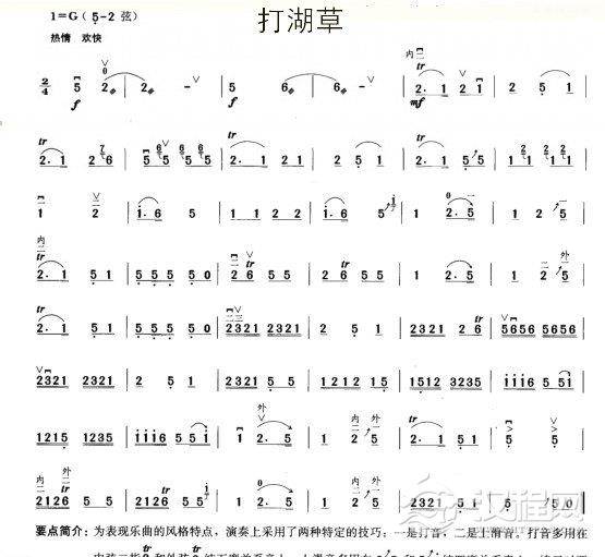 二胡谱【打湖草】打湖草二胡曲谱为表现乐曲的风格特点,演奏上采用了二种技巧,一是打音,二是上滑音。
