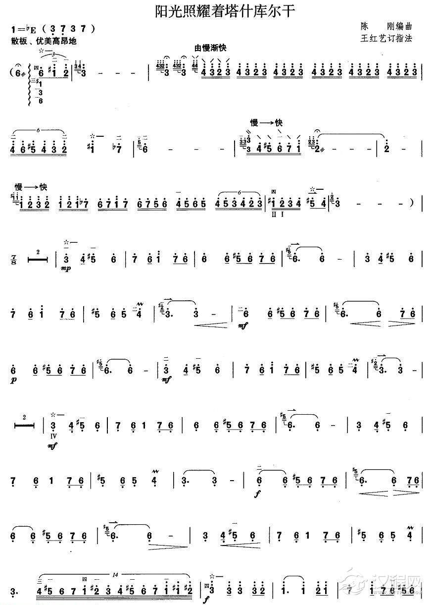 曲谱大全柳琴考级曲谱【柳琴考级曲目十级:阳光照耀着塔什库尔干】