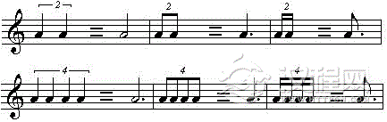 二连音和四连音与其它连音符的写法是相似的,不同的就是共同符尾上的数字。