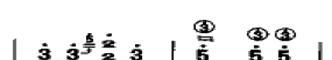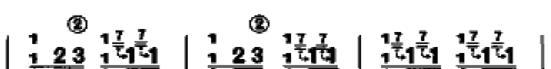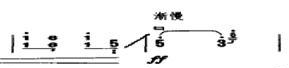 (2)速滑音:顾名思义,左手先将弦按至需用要的音高,拨弦时,略退稍许,快速滑至原音高,时间极短,音程一般在大二、小三度的上下滑音,如:75小节: