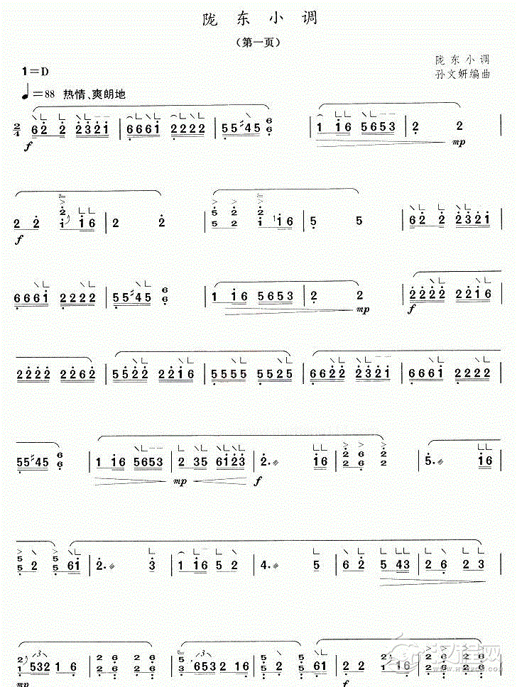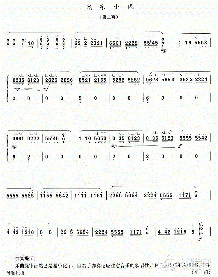 《陇东小调》是用陇东民歌编曲的筝曲,用“四点”的弹奏技法将富于民歌风的音调变得器乐化了。