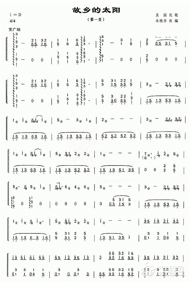 这是一首以同名美国民歌《故乡的太阳》编配的古筝小品。该曲运用古筝特有的琶音、和弦、长摇等演奏技法,配以西方音乐典型的节奏音型,展示了人们对家乡的热爱之情。演奏时请注意按弦的音准(不可加各种滑音)以及旋律速度的变化。