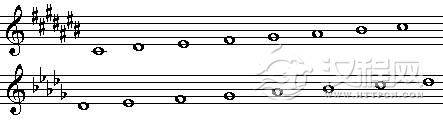 其中每一对等音调的音阶在键盘上的位置是完全一样的,只是记谱不同,音名不同而已。