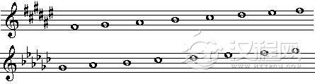 从上面调的五度循环圈中,我们就可以发现在七个升降号以内的各调中,有三对等音调: