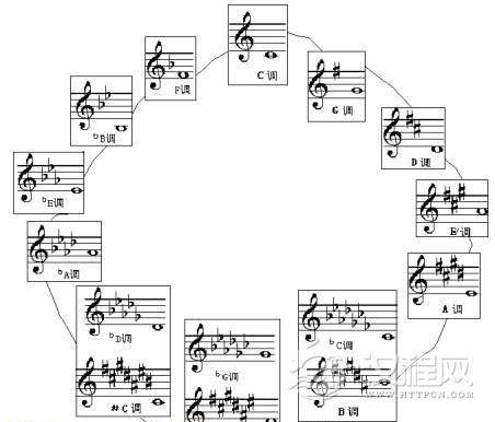 我们将七个升降号以内的各调,按照纯五度关系分别向上、向下排列,就构成了调的五度循环。