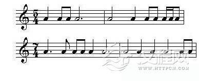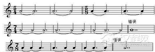 2、等于整小节的音值,要根据混合拍子的结构次序来分写几个音符,然后用边线相连,而不能用一个单独的音符来表示。