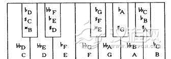 将基本音级降低2半音,叫做“重降音级”, 用“bb”记号写在基本音级的左上方来表示降低全音。如bbF,读作“重降F”。