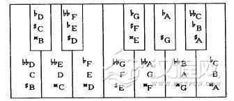 在前面我们讲到基本音级和变化音级时,所用的各个音级名称的键盘图表中,就可以看到,在一个琴键上就有两到三个音名,这两个或三个音名之间就互为等音。