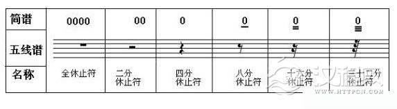 在音乐中并不都是音符,也有不发音的时候,不发音的地方就是有休止符在起作用。一般人对音符比较重视,却忽略了休止符的存在,其实这是十分错误的。休止符与音符一样,是音乐的有机组成部分,在音乐中,有什么样的音符就有什么样的休止符。简谱中的休止符是用0来表示的(前面已有讲解),而在五线谱中,休止符就如同音符一样,是用它的形状和位置来表示休止的时间长短(休止符只有时值,没有音高)。