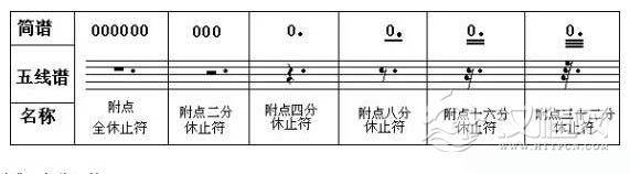 在五线谱中,休止符与音符一样也可用附点来增加休止符休止的时值长短。请看下表: