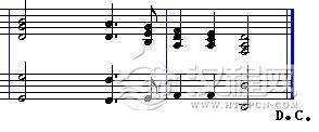 D.C.记号是外语Da Capo 的缩写,意思是“从头反复”或“再来一次”。在乐谱中见到D.C.的标记时就要从头开始演奏,