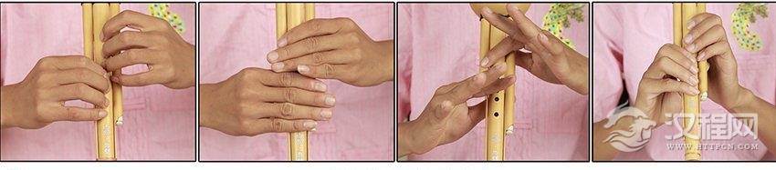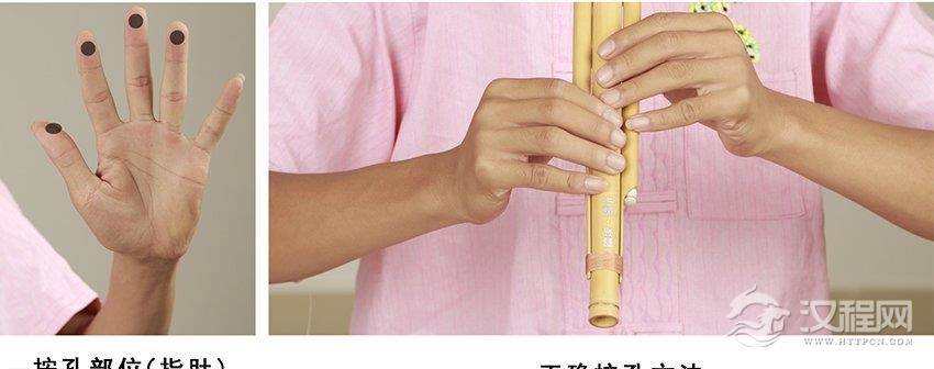 右手:无名指、中指、食指用第一节指肚分别开闭第一、二、三音孔,拇指托于主管下方(第三孔正背面)。