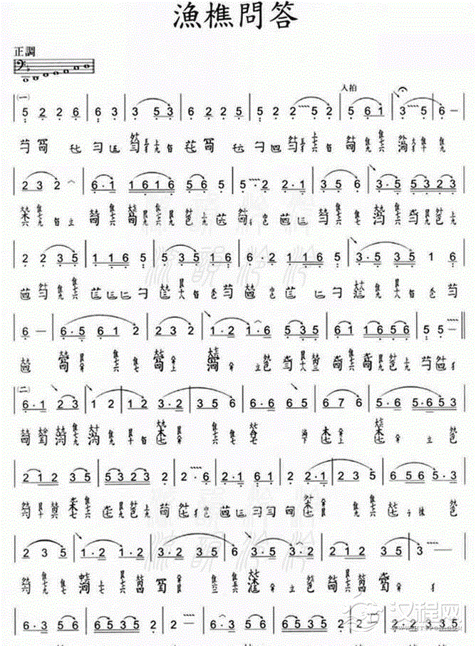 渔樵问答:古琴曲,曲谱最早见于《杏庄太音续谱》(明萧鸾撰于1560年):“古今兴废有若反掌,青山绿水则固无恙。千载得失是非,尽付渔樵一话而已”。此曲反映的是一种隐逸之士对渔樵生活的向往,希望摆脱俗尘凡事的羁绊。音乐形象生动,精确。