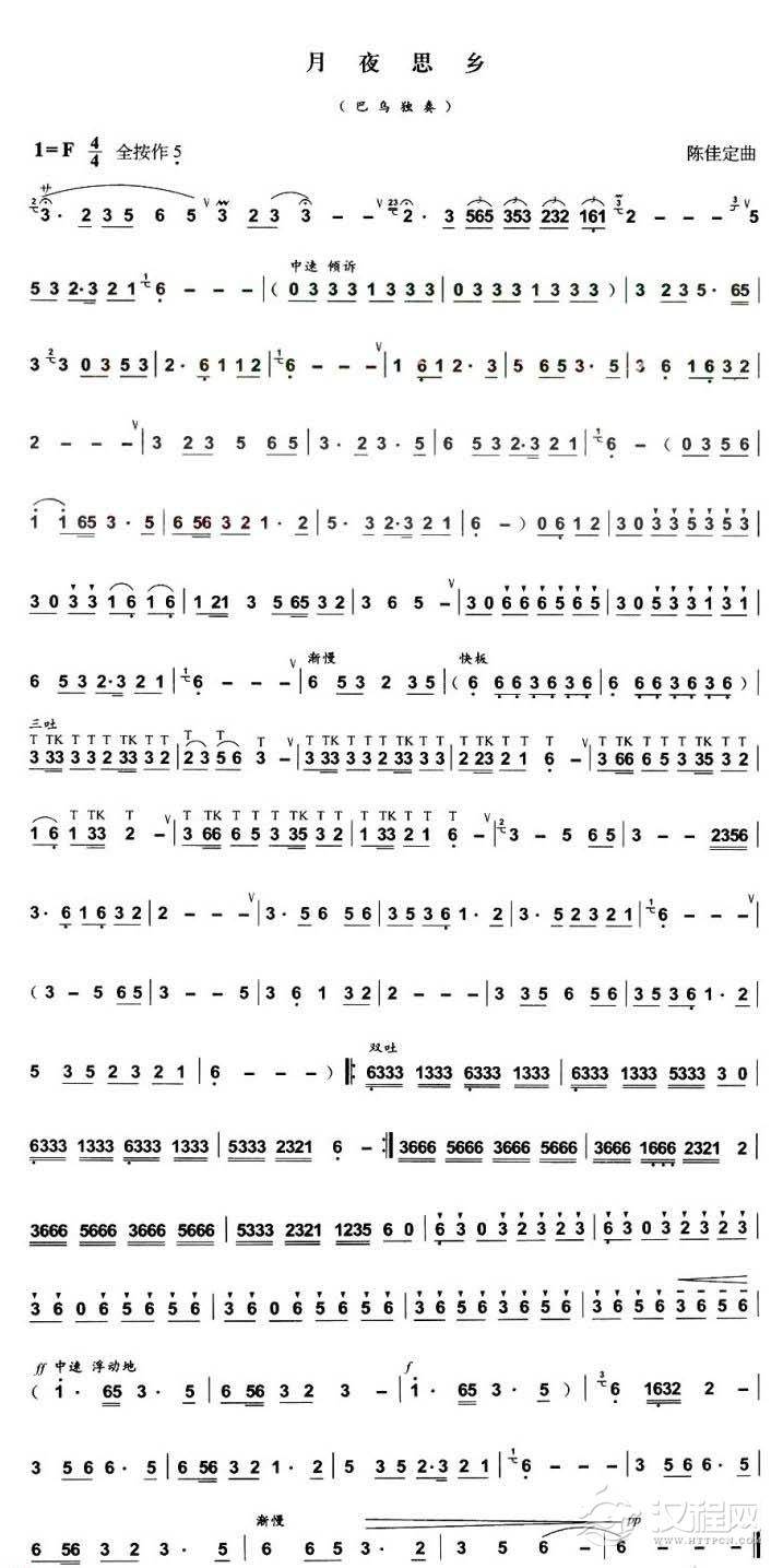 曲谱大全巴乌独奏谱《月夜思乡》五线谱