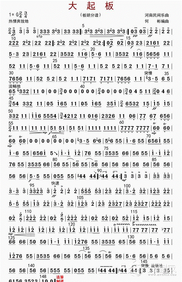 曲谱大全板胡谱《大寨红花遍地开》板胡分谱