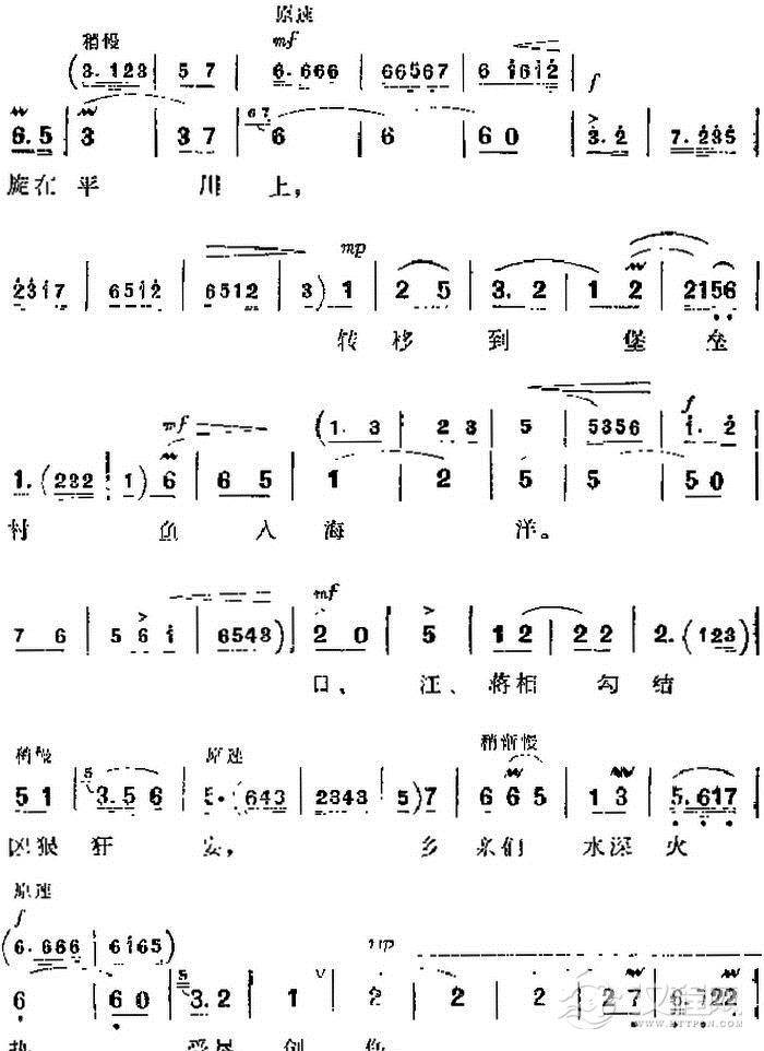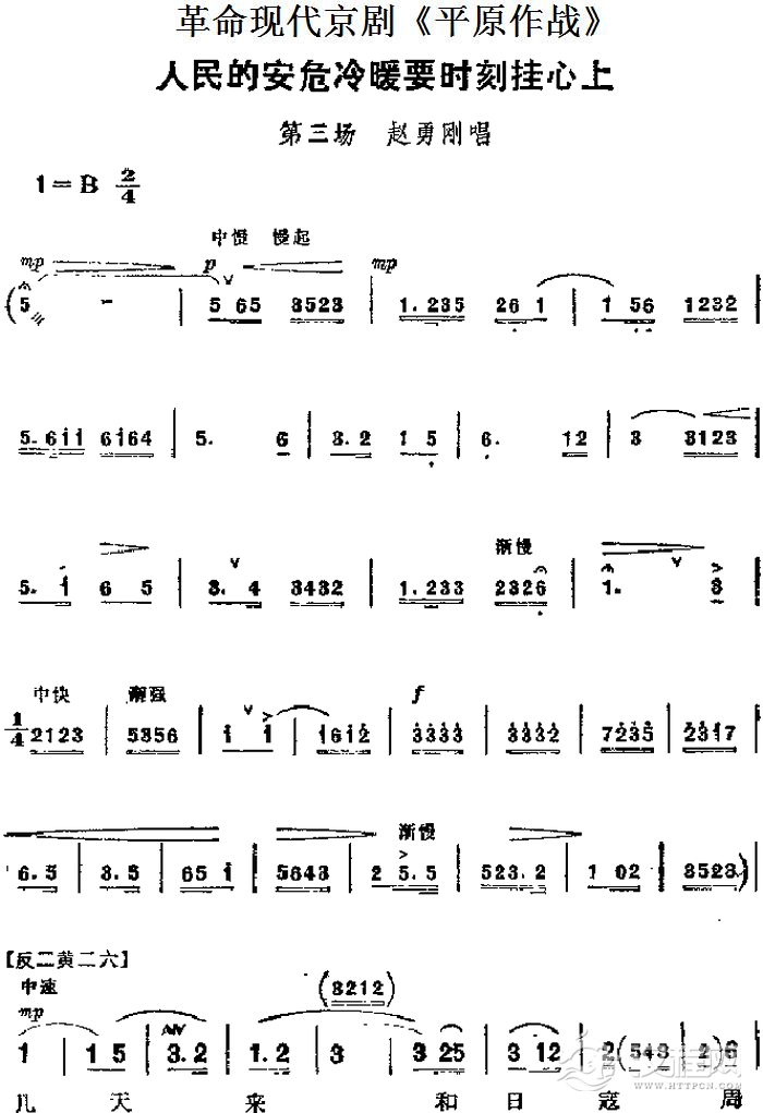 戏曲曲谱革命现代京剧《平原作战》主要唱段:枪林弹雨军民隔不断(第三场 张大娘、小英对唱)