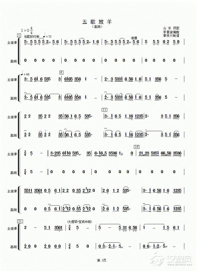 曲谱大全板胡考级曲谱《花儿与少年》一级