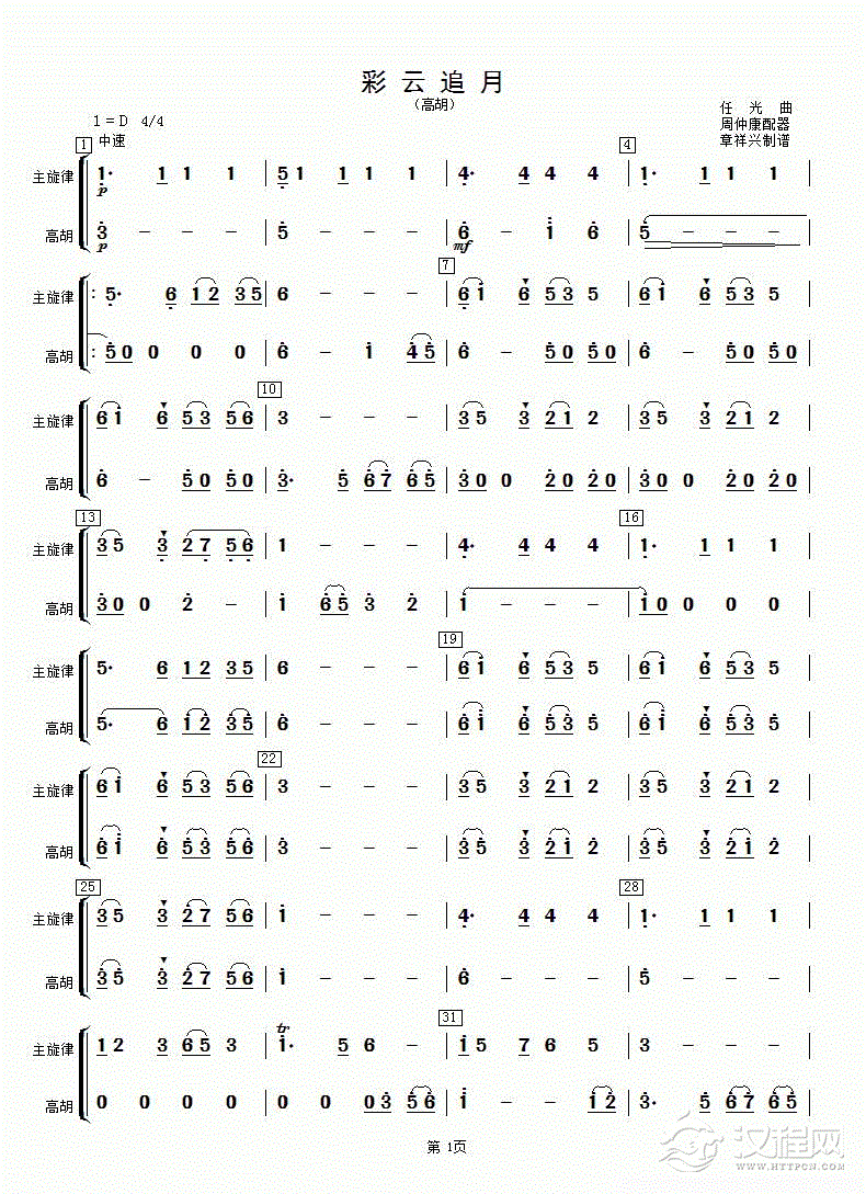 曲谱大全高胡谱子《彩云追月》二胡与笛子主旋合成谱