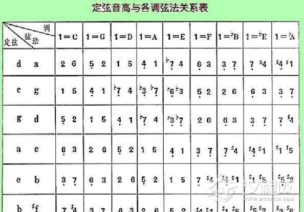 二胡定弦音高与各调弦法关系图表