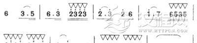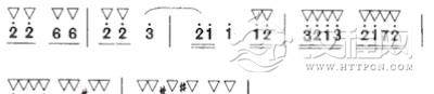 2、若遇到刚换弦几个音后又需要换弦,在这种情况下用调整跳点的方法来解决换弦就显得很吃力,发音也不好,这时就可采用固定跳点,调整弓子张力的方法来解决。这种办法是以内弦跳点为准,演奏外弦时大指向外加力顶推弓杆,同时中指向内加力压弓毛,借此来增加弓子的张力,使内外弦弓子的张力相等,在同样的演奏速度下,内外弦自然跳弓的跳点就统一在一点上了。