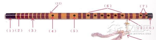(7)基音孔 (8)后镶口 (9)助音孔 (10)飘穗 (11)笛塞
