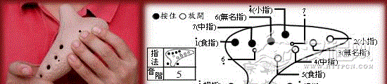 4.右手的拇指与无名指、小指需特别注意,在吹奏高音域时指头停放的位置。左手小指是最高音,吹奏时打开音孔,用第二关节托著陶笛本体。