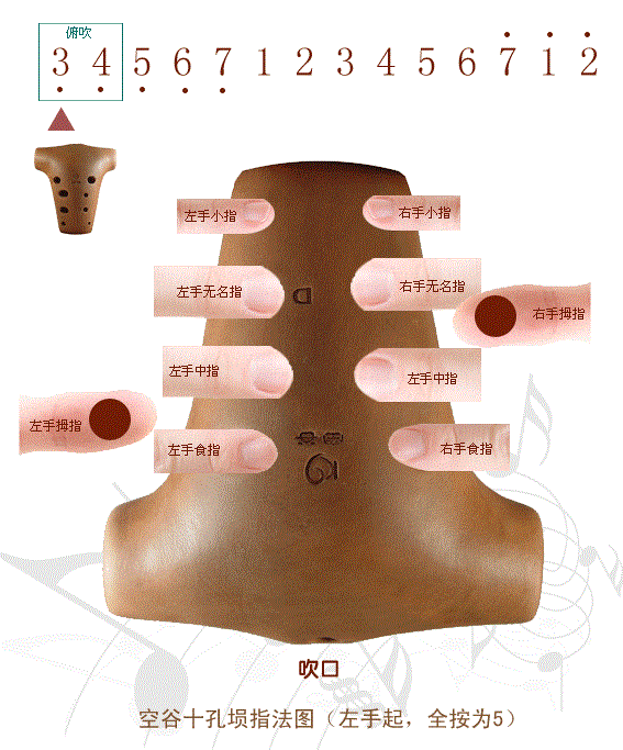 筒音做低音5或中音1较为常用,下图为十孔埙交叉指法动画图,非常直观,此指法适用于空谷、冯氏、阴氏等品牌埙。