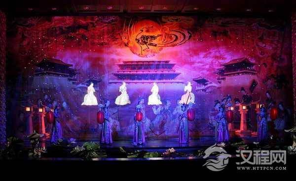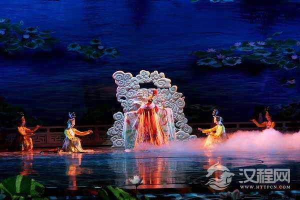 梦浴华清:音乐骤然而止,令人可思难描的杨贵妃出现在舞台中央,身披轻纱的宫女手挽花篮将芬芳的芙蓉花瓣撒向池中,舞台上下顿时花香飘渺。在一片嬉戏声中,贵妃悠然而舞,扑鼻的花香和性感的舞姿让台下的观众神魂飘逸。