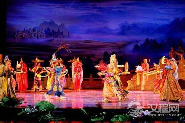 梦萦西域:在荡气回肠、欢快奔腾的胡乐声中,帷幕落下,丝绸之路幅幅风光再现视野,大唐使宫带领着万国使节手捧宝藏向前进发;幕后灯光淡出淡入,隐约可见外国遣唐使的驼队、象队和一组火烈鸟由近至远。