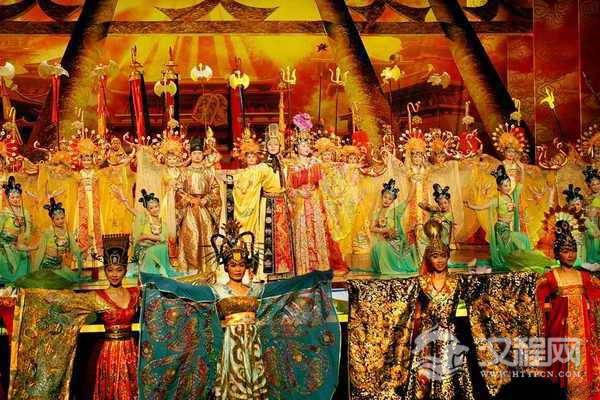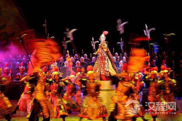 梦邀秦王:阵阵的号角声,远处的撒杀声,让我们似乎又回到了远古时代的疆场。帷幕缓缓地拉起,在红色的霓彩中,观众们正在为舞台背景中的似真似幻的千军万马而感到惊讶时,从地面升起了三架巨形战鼓,明皇奋力击鼓,金甲、银甲双面武士在舞台上开始列阵舞旗,军队中突然闪现出一对轻甲龙凤武士,长枪相对、风驰电掣、刀光剑影、惊心动魄。前景的武士和背景中遍野晃动的军团给人一种排山倒海、所向披靡,就连皇亲国戚,也撼其心魂。