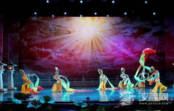 梦幻霓裳:蓝色是梦的主旋律,是幻想的源泉;红色是热情奔放的渲泄,是生命的体验;紫色是高贵的代名词,此时这些造型元素都同时汇集在舞台上。帷幕拉起,8位着装艳丽的飞天,手舞长缎飘然而落,在大小提琴错落有致的优美音乐中,她们婀娜多姿、娇媚百态、起舞于梦幻之中;突然七只绝艳的灵鸟扇动着七彩的翅膀飞入眼帘,紧跟着二十四只彩翼蝴蝶又包围了观众的视线,在美伦美幻的炫灯的照耀下,舞台上顿时变成了浮动的七彩琉璃、梦的天堂。梦幻般的舞台,给观众造成了强烈的视觉、听觉冲击,让人如醉如梦。