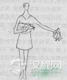 2.手形:左手持巾,右手持扇。