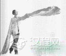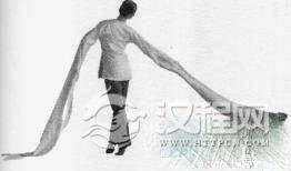 这个抖袖组合中,袖多与旁提、拧、仰等身法动律相结合,并注重将气息贯穿于发力、落袖的整个过程中,使袖体的“撩”、“摆”随着身体的方向变化,展现出连绵不断的动态美。