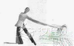 [34]身对4点,向6点右手正抖袖,小八字步,头向6点下方,再向3点左手正抖袖,经仰胸落袖,右前点步蹲。