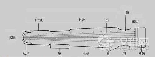 答:琴是由“琴体”、“雁足”、“琴弦”、“琴轸”等部件组成。在琴体最右边的部分叫“琴额”,“琴额”上镶嵌着“岳山”,这是琴的最高部分。“岳山”靠额一侧镶有“承露”,上有七个“弦眼”,用以穿系琴弦。其下有七个用以调弦的“琴轸”。琴弦从 “岳山”起,通过“琴颈”、“琴肩”、“琴腰”、“焦尾”到达“龙龈”缠绕在“雁足”之上。琴头侧端,又有“凤眼”和“护轸”。在琴面上还有十三个徽,这是泛音震动点的标记。 琴底部有大小两个出音孔,位于中部较长的称为“龙池”。位于尾部较短的称为“凤沼”。