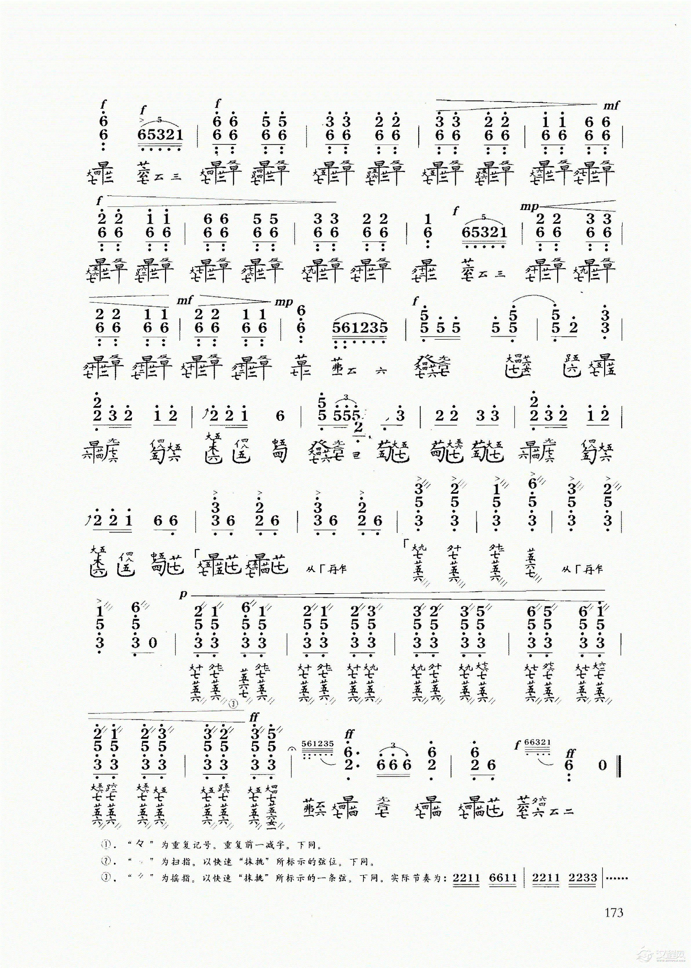作者在处理旋律时,采用食指持续的急速抹挑,不仅使长音得到延续,而且力度变化自如。这种手法突破了古琴对于长音只作节奏变化的传统。