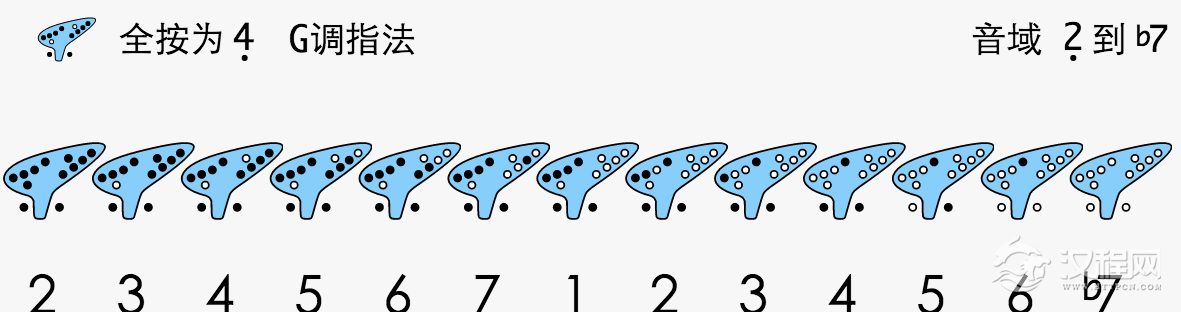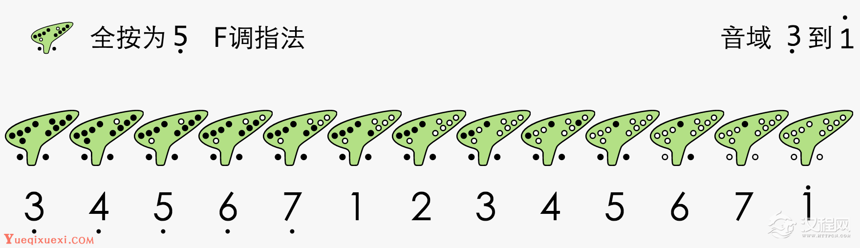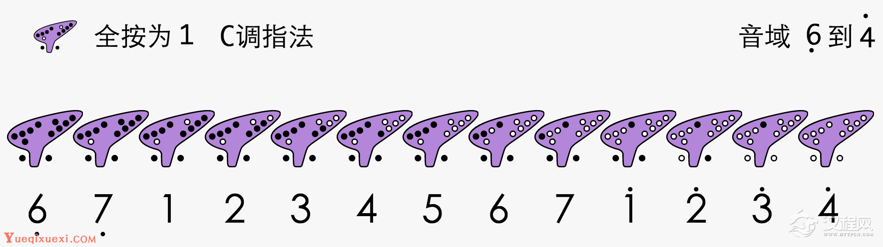 十二孔陶笛采用不同指法可以吹出音域不同音阶。下面的图片是指孔全按(不包括食指所负责的那两个小孔)为1的指法,这是十二孔陶笛最基本的指法,可以吹出低音6到高音4的音阶。