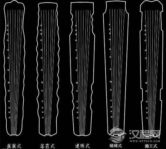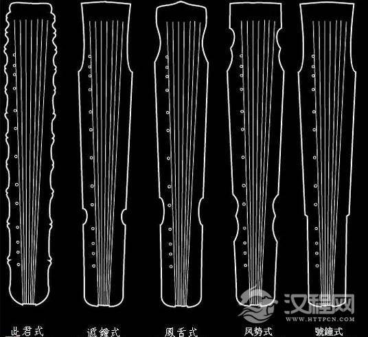 在存见的古琴中,常见的为伏羲式、仲尼式、连珠式、蕉叶式、落霞式、凤势式、师旷式、神农式、灵机式、响泉式、亚额式、列子式、鹤鸣秋月式及宣和式等式样,古琴制式虽多,但主要的差别只是在项部和腰部的样式有所不同而已。