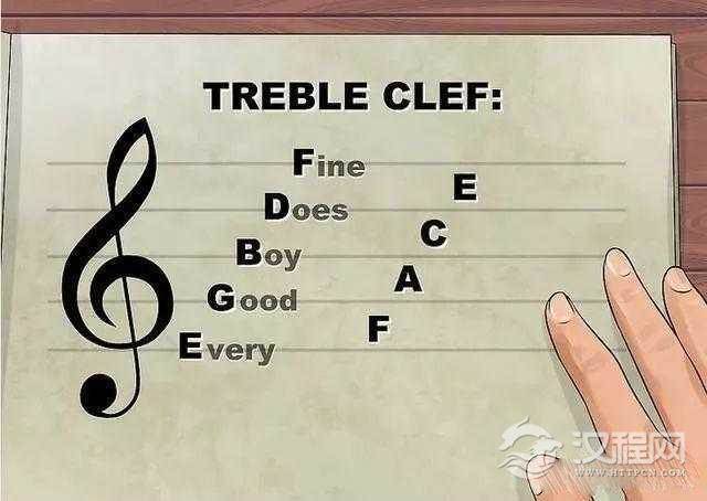 高音谱号又名G谱号,来自于花体的拉丁字母G。只要记住谱号中间有一根盘旋而上的线的便是高音谱号。高音谱表的每条线和间都有不同的含义。五条横线从下到上依次代表五个音:E G B D F。四条间(线与线之间的空隙)从下到上依次代表四个音:F A C E。要把全部音符记下来看似很难,但我们可以使用一些口诀 。比如用“儿歌不断放”来记线上的音。用“FACE”这个英文单词来记间上的音。