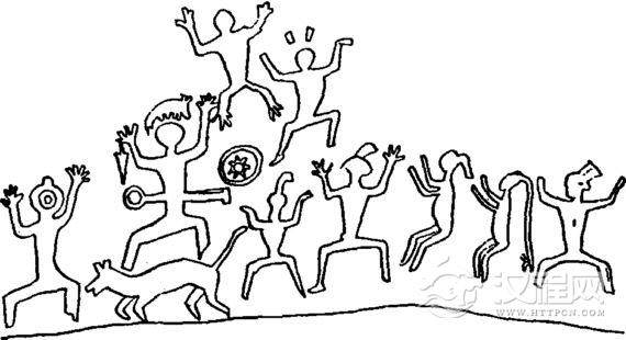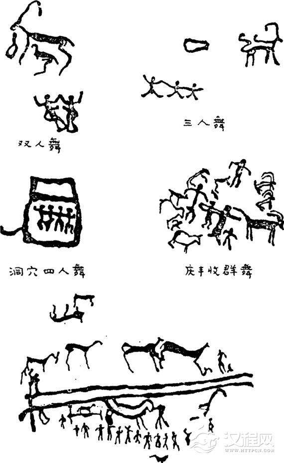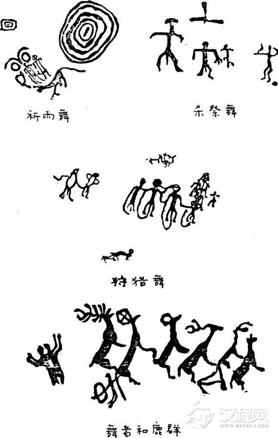 除了上述青海大通彩陶盆上的舞蹈图,在中国的北方和南方还有不少岩画,描绘着从远古到战国时代的舞蹈形象。