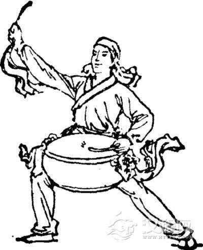 击鼓而舞,在秦汉时代已有“盘鼓舞”、“建鼓舞”、“鼙舞”等舞种。到了宋代,鼓的表演突飞猛进,舞队里还出现了“斗鼓社”。
