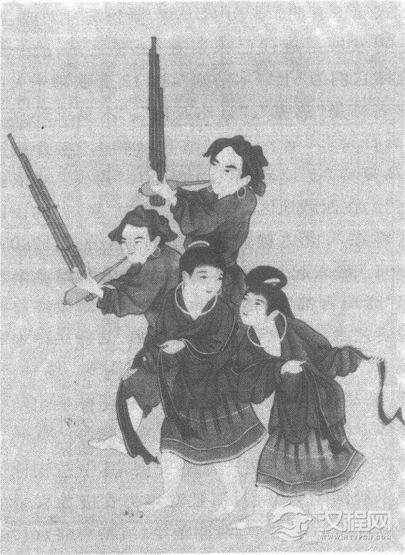 正当汉族音乐在明清时期进入说唱音乐和戏曲音乐的鼎盛阶段时,边疆少数民族音乐却仍处于以歌舞音乐为中心的黄金时代。在新疆维吾尔族地区,以“木卡姆”为代表的古典歌舞音乐盛极一时。木卡姆渊源于龟兹乐,它的结构形式属于套曲,每套由歌、舞、器乐综合而成。木卡姆发展至近代已积累有12套之多,故一般统称它们为“十二木卡姆”,这12套歌舞乐大曲的名称是“热克”、“且比亚特”、“木夏维热克”、“恰日朵”、“潘吉朵”、“欧孜哈勒”、“埃介姆”、“乌夏克”、“巴雅特”、“纳瓦”、“思朵”、“依拉克”。在西藏地区,一种藏语称为“囊玛”的民间歌舞在八世达赖强白嘉措时期(公元1780—1804年)兴起,它主要在民间音乐歌舞业余组织“囊玛吉都”中传播,也是歌、舞、器乐综合性表演艺术,其歌唱有独唱和重唱,其器乐伴奏有独奏、重奏和合奏。乐器使用扎年琴、扬琴、笛子、贴胡、藏胡琴和串铃,具有藏汉音乐相结合的特点。在西南地区,苗、瑶、侗、彝等民族的古老芦笙乐舞有了更广泛的发展,其中苗族称这种乐舞活动为“跳月”,是青年男女极为喜爱的民俗音乐活动之一。清谢圣纶《滇黔志略》(1763年序)记载:苗族男女青年跳月时,“择平壤地为月场,鲜花艳妆,男吹芦笙,女振响铃,旋跳歌舞”,热闹非凡。所用芦笙有大、中、小等多种,合乐之时,声震林木。清刻本《广舆胜览》中绘有《跳月图》一幅,两男两女正在一起跳芦笙舞(图44)。在云南彝、白族地区,节日聚会时非常喜好“打歌”。“打歌”又称“跌脚”、“踏歌”,是一种歌舞形式,表演时参加者围成圆圈边唱边跳,有的还用芦笙和笛子伴奏。清桂馥《滇游续笔》(公元1813年刻本)所说“男女相会,一人吹笛一人吹芦笙,数十人环绕踏地而歌,谓之‘踏歌’”就是这种乐舞。今存云南巍山文龙亭清代壁画《打歌图》,就是这一乐舞形象的生动记录。