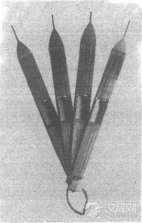 此时期各少数民族乐器在文献中也较以往时期有了更多的记载。在北方蒙古族地区,蒙语称为“胡兀儿”的拉弦乐器四胡和称为“潮儿”的拉弦乐器马头琴,业已发展成为独奏性能较高的乐器,蒙文著作《成吉思汗箴言》就赞美了这两件乐器的“美妙乐奏”。今传四胡曲《八音》,马头琴曲《朱包烈》等,就是明清时期蒙古族艺人传承下来的作品。另外远古时代产生的舌簧乐器“簧”(口弦),至明清时早已在汉族地区绝迹,但各少数民族地区却仍然有口弦在民俗音乐活动中流传(图45)。清余庆远《维西见闻记》(1770年序)详细地介绍了纳西族和白族(那马支系)使用的竹制拉线式单簧口弦和指弹式三簧口弦,并称白族那马人“皆以筒佩之,弹以应歌曲,弹者身舞足蹈而与歌合节。”其他还有采用古老乐器伴奏兼作道具的“长鼓舞”、“铜鼓舞”、“古瓢琴舞”、“弦子舞”、“象脚鼓舞”、“杵乐”等,也分别在瑶、朝鲜、壮、佤、布依、苗、彝、傣、布朗、高山等族中流传。它们作为有关民族传统文化的象征和标志,迄今还在民俗音乐生活中占据重要位置。