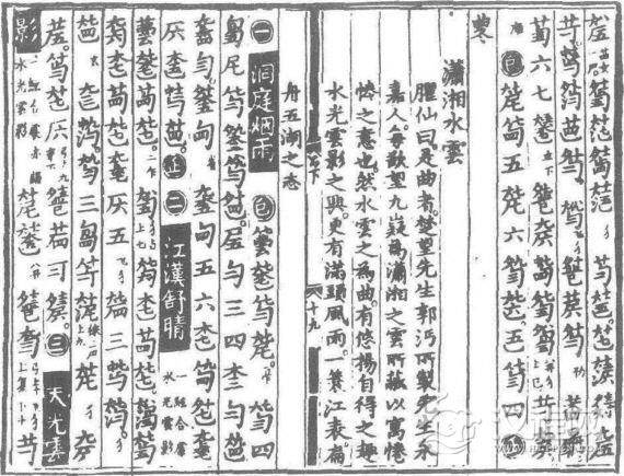 《潇湘水云》作者郭沔〔mian免〕,字楚望,永嘉(今浙江温州)人。他是宋代杰出的古琴家(约公元1190—1260年),浙派古琴艺术的创始人。南宋末年,元军南下侵浙,大批文人南迁,郭沔也随之移居湖南衡山附近。当他在潇水湘江合流的地方,站在船上眺望九嶷山上云海,环顾四方林木山水时,顿时激起了对祖国美好山河的无限眷恋,于是便作成此曲以表现其波澜起伏的思想感情。乐曲使用古琴特有的散音、按音和大幅度吟音等技巧,成功地塑造出了云水掩映、烟波浩渺的艺术意景,从而抒发出作者对国势牵肠挂肚的爱国主义情怀。全曲原有十段,至清代经各家琴师加工锤炼,艺术上更加成熟。今存明刊本《神奇秘谱》收有此曲乐谱(图35)。当代出版的《古琴曲集》已将此曲译为现代曲谱收入其中。