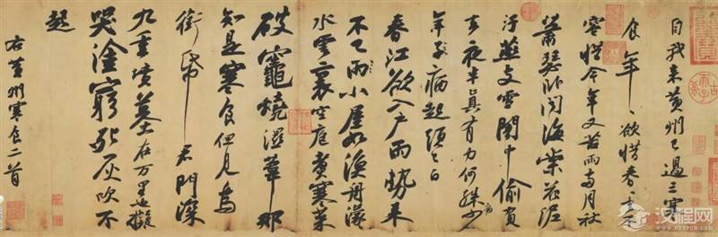 苏轼大概是嗓门最大的那个。他挥挥手说,哪来那么多规矩?我写字就是“意造”,心里怎么想,手就怎么写,“点画信手烦推求”。他追求那种没打算写好、却自然妙了的境界,觉得书法就该是性情和学问的自然流淌,像说话唱歌一样。你可以想象,这种主张在看重法度的古人听来,多有点“离经叛道”。他的《黄州寒食诗帖》是最好的证据。你看那纸上的字,开头几行还算平稳,带着点克制;可写到“空庖煮寒菜,破灶烧湿苇”时,生活的困顿和心里的烦闷好像一下子涌到了笔尖,字忽然变大了,笔画变重了,行距挤在一起,那种愁苦压抑简直要破纸而出。这哪里是在“写字”,分明是用毛笔在纸上喘息、呐喊。技法?那一刻,技法完全臣服于情绪。
