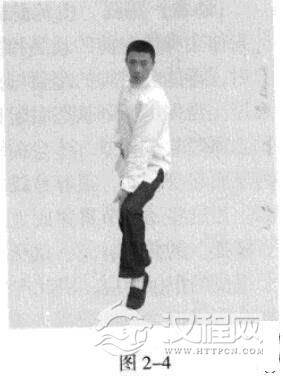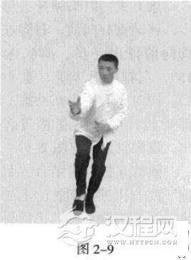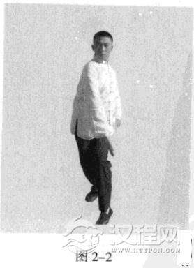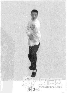 侧身站立,双腿弯曲,前脚尖内扣约巧。虚点地,前膝向内裹合,后脚尖向前,膝内裹,重心在后;双手腕放松;目视前方。(图2-1)