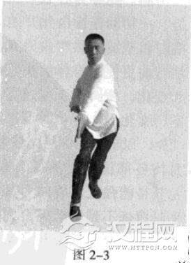 承上式。仍然以头领身,身带步使重心前移,在重心前移、身体失重的情况下,右脚为了保证重心,不自主地过左脚向前踩出一步,脚尖着地,内扣约15度。左脚随之追上半步;同时,左手顺胸腹经右胯、右腿外侧,向正前方以指尖部发力,指尖指向前下方,掌心朝向右侧。(图2-3)