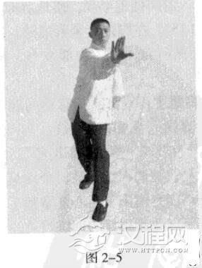 接上式。以头领身,身带步,移动重心向前,左脚向前方踩出一步,脚尖内扣15度。右脚随追半步,重心在后;同时,左手下按外拨,腰部旋转,顺势将右掌向前推出,掌根发力。(图2-5)