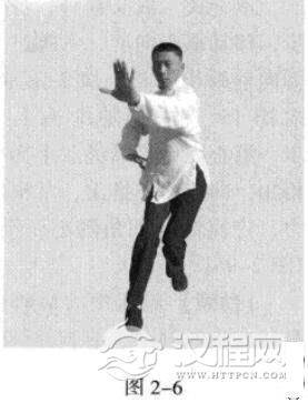 承上式。以头领身,身带步,移动重心向前,右脚过左脚向前踩出一步,脚尖内扣15度,左脚随迫半步,重心在后;同时,右手下按外拨,腰部旋转,顺势将左掌向前推出,掌根发力。(图2-6)